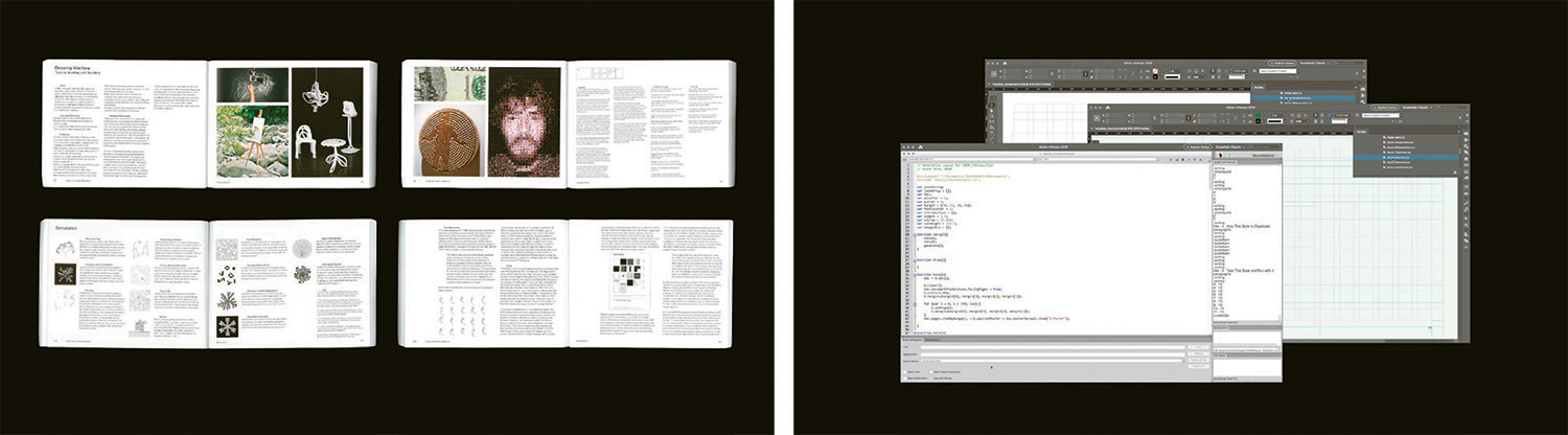 가령, 제가 디자인한 MIT Press의 『Code as Creative Medium』의 경우 “95%에서 98%는 코드로 자동화 했고 나머지 해결하기 어려운 부분은 인간 디자이너가 보정했습니다”라고, 많이 얘기를 하는데요. 사실은 코드로 조금 더 큰 비중의 작업(task)을 자동화하려고 했어요. 근데 프로젝트 데드라인, 진행 상황 등을 고려했을 때 ‘소요되는 노동에 비해 결과물에 큰 차이가 없겠다’란 판단이 들었어요. 이 프로젝트에서 재미있는 점은 MIT Press의 출판 관계자, 편집자, 저자, 디자이너 모두 이 제작 프로세스를 믿고 지지해 주었다는 점이에요. 아마도 처음부터 인간과 기계가 협업할 수 있는 과정을 디자인했기 때문이라고 생각해요. 그냥 프로세싱(Processing)이나 자바스크립트(Java Script) 이런 거를 이용해서 여러 페이지의 결과물을 만드는 건 간단해요. 그런데 그렇게 책을 만들면 사람이 컴퓨터가 만들어 낸 결과물에서 어색한 부분이 있어도 수정하기가 까다로워요. 반면 이 책을 디자인할 때는 어도비 인디자인 내에서 구동되는 스크립트를 썼거든요. 그래서 협업했던 디자이너들이 컴퓨터가 생성한 결과물의 세부적인 부분을 수정할 수 있었어요. 즉 컴퓨테이션을 사용한 목표가 그저 완전 자동화는 아니었던 것이죠.