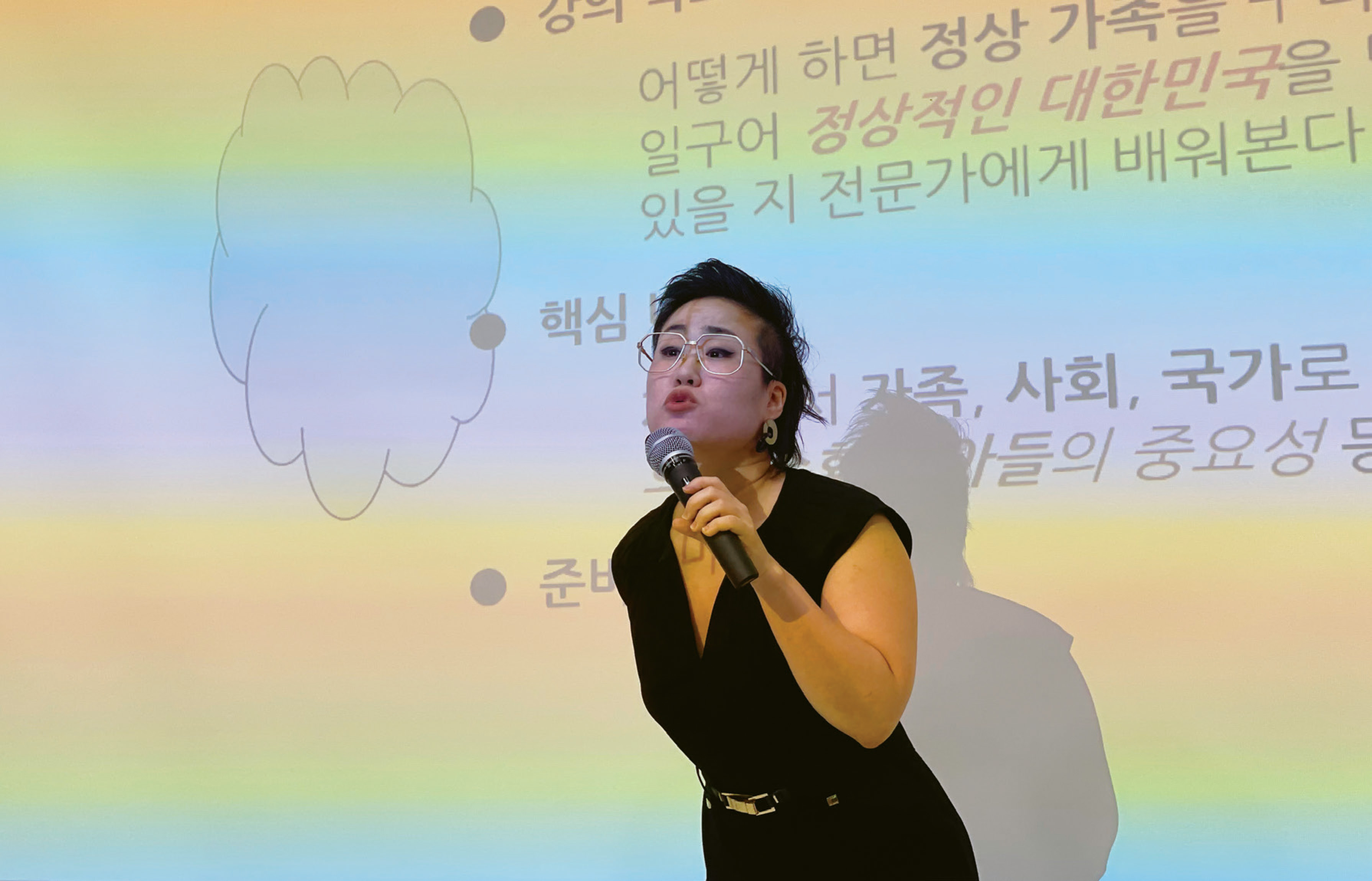 퍼포먼스 〈MAKING A NORMAL FAMILY〉 전경 ©이반지하 “오케이. 너희가 원하는 거 다 해줄게. 어. 퀴어 얘기 안 하지. 젠더 얘기 안 해줄게. 동성애 빼줄게. 근데 내가 어마어마한 강연은 해줄게. 니네가 듣고 싶다는 그 강연.”