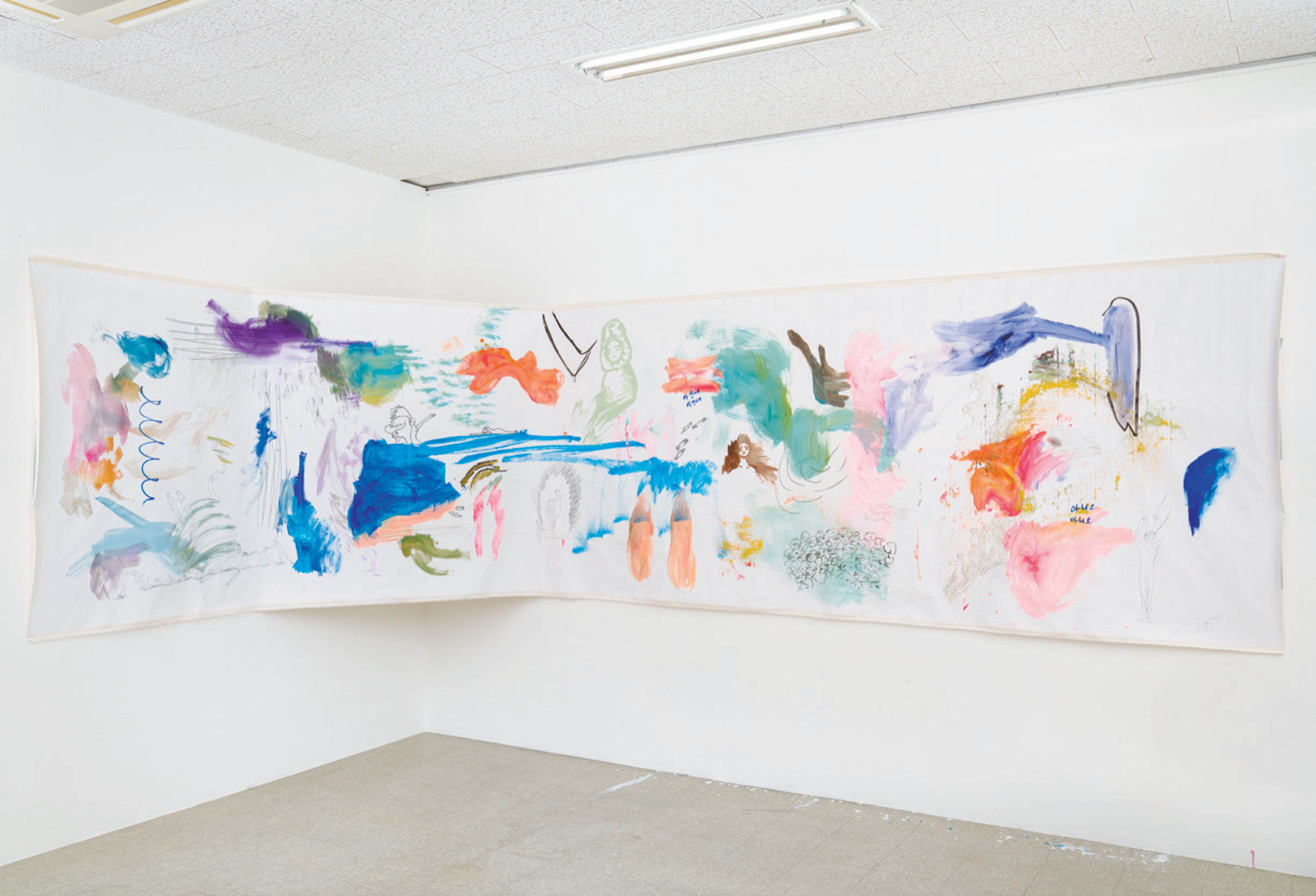 그림을 그리는 방식도 오랜 시간을 두고 그리는 것이 아닌 한순간에 그려버리는 방식을 택했기 때문에 캔버스의 사이즈가 커질수록 더 강한 체력과 집중력이 요구된다. “최대한 캔버스와 나 사이에 장애물이 없기를 바라요. 떠오르는 것을 바로 옮기기 위해서 순간에 엄청나게 집중해요. 되게 빨리 그려요. 왜 빨라야 하냐면, 제가 좋아하는 말인데, 트라우마보다 더 빨리 달려서 트라우마가 도착하기 전에 붓을 그어버리기 위해서예요.”