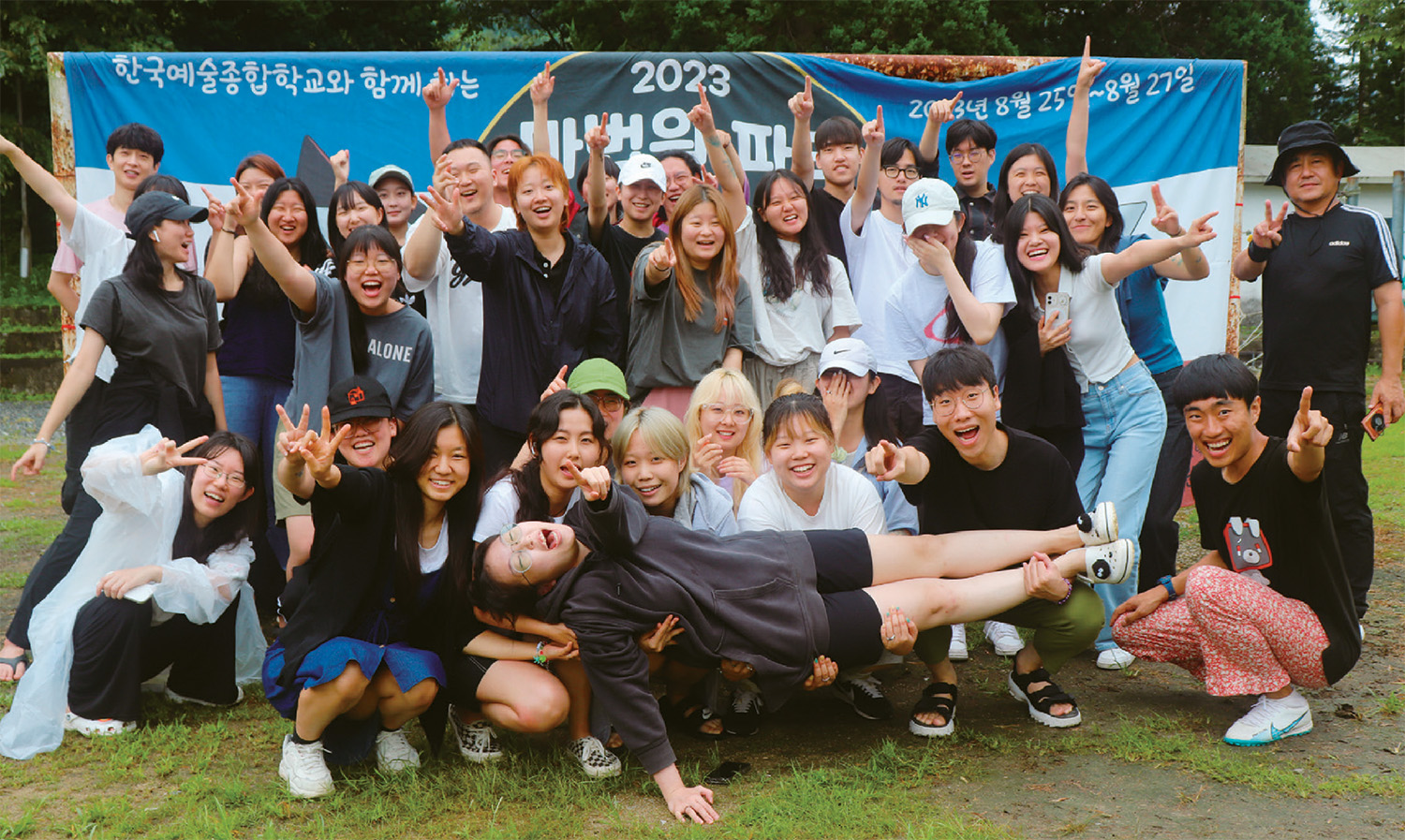 한 달의 참가 신청을 받은 끝에 105명(한국예술종합학교 재학생 35인 + 초등학생을 포함한 가족 단위 참가자 70인)의 참가자가 모였다. 2023년 8월 24일부터 28일까지 총 4박 5일간 전라남도 구례의 한 캠핑장에서 〈마법원 파티〉가 개최되었다. ‘파티’라는 탈을 쓴 실험의 시간이었다. 우리의 질문은 다음과 같았다. 굳이 다음 단계로 넘어가려고 하지 않는 예술을 다 함께 향유하는 순간의 경험이 과연 참가자들에게 도취라고 표현해도 될 정도의 집중력을 불러일으킬 수 있을까? 이 글은 행사가 끝난 직후, 〈마법원 파티〉의 기획자가 직접 쓰고 있다. 그렇기에 객관적인 판단이 어려울뿐더러, 프로그램에 참여한 사람들의 생각을 일일이 다 알 수는 없겠지만, 확실한 도취의 순간들은 분명히 존재했다. 그리고 그 도취는 곧 무언가로부터의 초월을 의미했다.