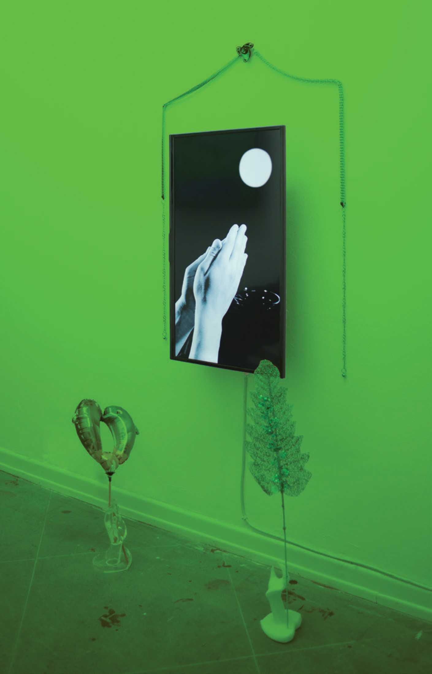 김실비 작가의 〈실재계 길목의 제단〉은 2018년 서울 합정지구 개인전에서 첫선을 보였고, 사진은 2020년 쾰른 멜랑주 개인전에서 재구성한 버전이다. 자본이 스스로를 불려나가고 기술 또한 이에 발맞춰 첨예하게 발달하는 만큼 우리는 신체적 감각과 유리된다. 또한 누가 우리에게 욕망을 불어넣는지, 그리하여 자신이 원하는 실체가 무엇인지 판별하기도 어려워진다. 이러한 혼곤함에도 불구하고 우리는 끊임없이 신체로 돌아오며, 대상에 마음을 투영한다. 숱한 사물이 대량생산되어 세계를 떠돌다가 나에게 다다라 복사되고 별다른 뜻을 덧입는다. 이 제단은 안과 바깥, 앞과 뒤, 몸과 마음, 가상과 실재 사이에 있다. 영상과 설치물에서 정화수를 떠 놓고 달에 비는 손, 의지로 쥔 주먹, 뽐내는 자세를 취한 손가락 등은 동떨어진 극단을 매개하는 표현으로 등장한다. 바라고 그리는 마음, 행위하는 의지야말로 이루지 못한 것, 닿지 않는 곳에 우리를 다시 잇고, 인간이게 한다.