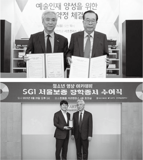 동원육영재단 이사장인 김재철 동원그룹 명예회장은 6월 26일 한예종 서초캠퍼스에서 예술 인재 양성을 위한 10억 원 기부 약정을 체결했다. 동원육영재단의 이번 기부 약정은 K-팝과 K-콘텐츠, K-클래식 등 최근 전 세계적으로 가치를 인정받고 있는 우리나라 문화예술 분야의 미래를 위해 지속적인 인재 육성이 필요하다는 김 이사장의 소신에 따라 이뤄졌다. 기부금은 한예종 음악원과 영상원 학생들의 장학금 등으로 활용될 예정이다. 한편 SGI서울보증은 6월 20일 한예종에 ‘문화예술 꿈나무 육성을 위한 장학기금’을 전달했다. 이번 기부금은 SGI서울보증과 한예종이 함께하는 ‘청소년 영상 아카데미’를 후원하며, 한예종 학생들의 장학금과 문화·예술 분야 진로를 희망하는 청소년들의 교육비로 사용될 예정이다.