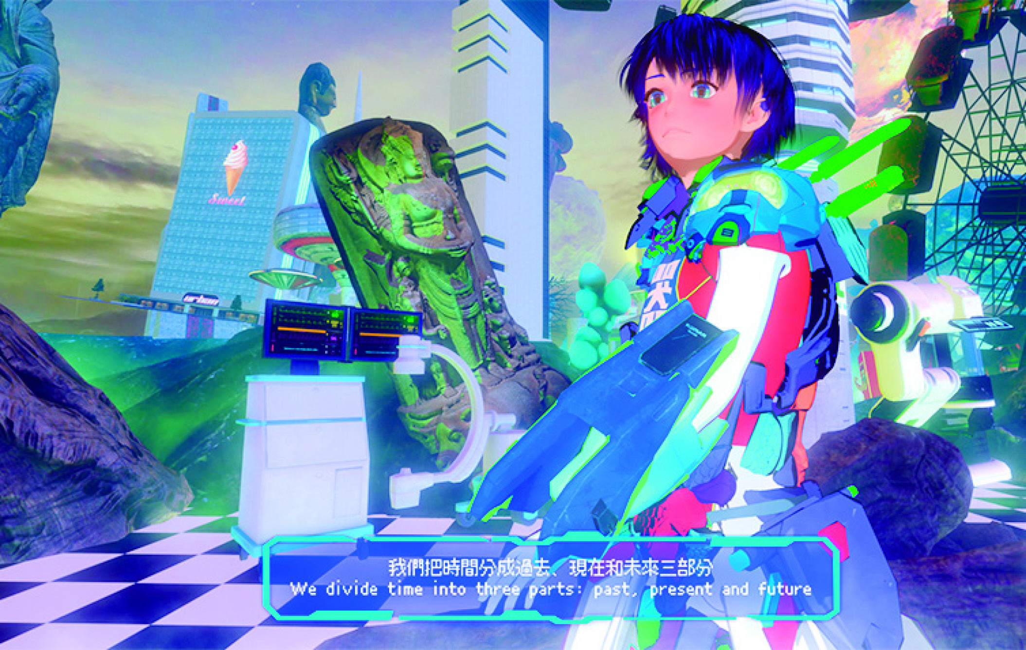 그 안의 루 양의 연작 〈물질세계의 위대한 모험〉은 수많은 레퍼런스를 바탕으로 만들어졌다. 일본 애니메이션, 종교적 도상, 디지털 기술, 컴퓨터 게임, 공상과학의 요소로 가득하다. 이를 통해 가상과 현실 사이의 이야기를 만들고 아케이드 게임과 애니메이션 형식을 빌려 인간의 본질과 인간 중심적 사고에 의문을 제기한다. 익숙한 형식과 모양새를 빌려 인간으로서의 정체성에 질문을 던지는 것이다. 람한의 〈튜토리얼: 내 쌍둥이를 언인스톨 하는 방법〉은 VR 게임의 형식을 차용하여 감각하는 존재에 대한 논의를 뽑아낸다. 시각 정보와 기억, 경험과 허구가 넘쳐나는 세계 안에서 실제의 감각과 그 주체가 명료한가, 질문을 던지는 것이다.