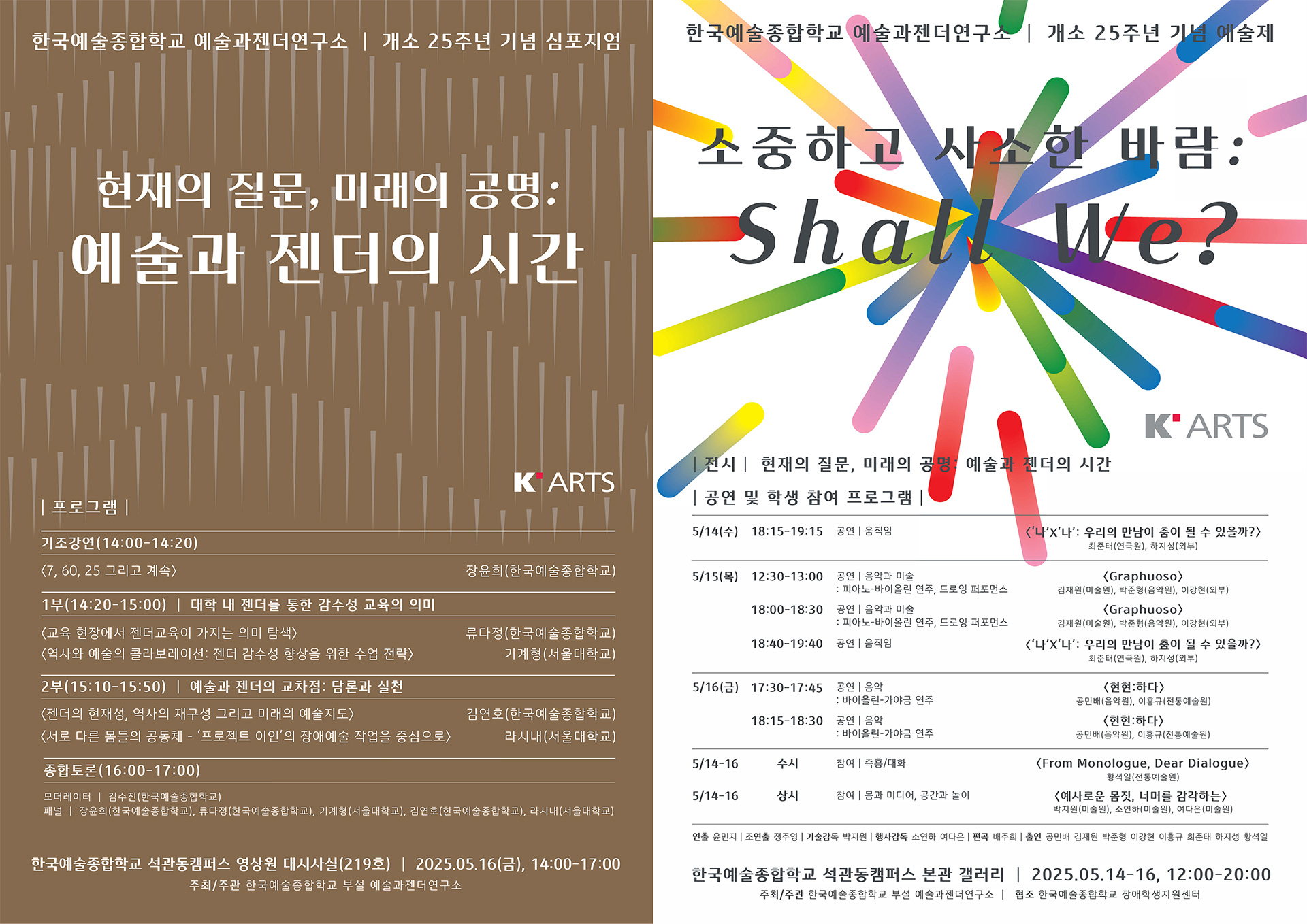 한국예술종합학교 부설 예술과젠더연구소(소장 황하영)는 개소 25주년을 맞이하여, 5월 14일(수)부터 5월 16일(금)까지 〈소중하고 사소한 바람: Shall We?〉를 주제로 예술제를, 5월 16일(금)에는 〈현재의 질문, 미래의 공명: 예술과 젠더의 시간〉을 주제로 심포지엄을 개최했다다. 이번 행사는 연구소의 지난 25년간 축적해온 학술적 성과와 실천적 흐름을 공유하고, 예술과 젠더의 교차점에서의 성찰과 미래적 비전을 모색하기 위해 기획되었다.