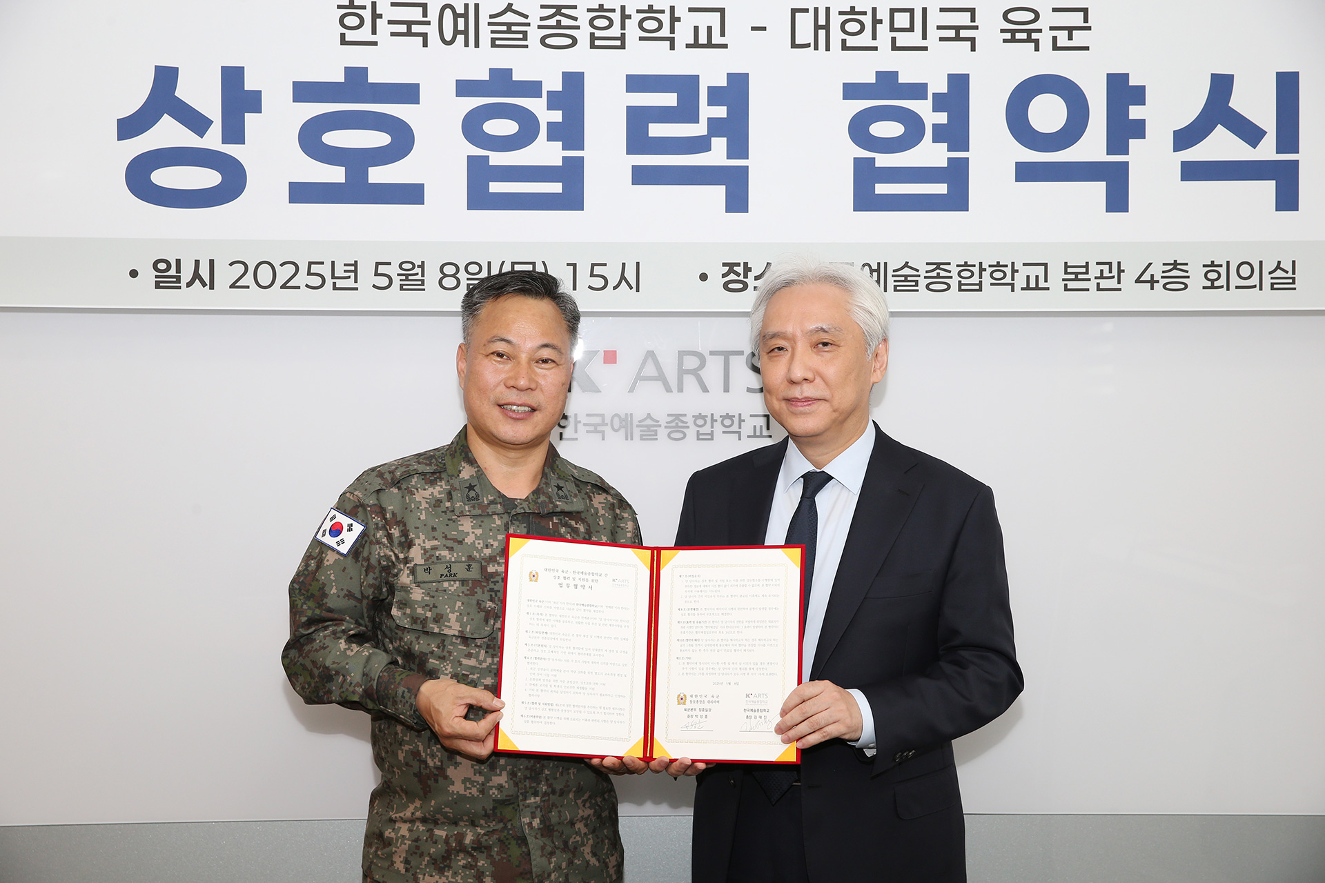한국예술종합학교와 육군본부(정훈실장 박성훈 준장, 이하 육군)는 5월 8일(목) 오후 3시 한국예술종합학교 본부 4층 회의실에서 육군의 문화예술 분야 역량 강화 및 문화정책 발전 교류를 위한 상호협력 협약을 체결했다.