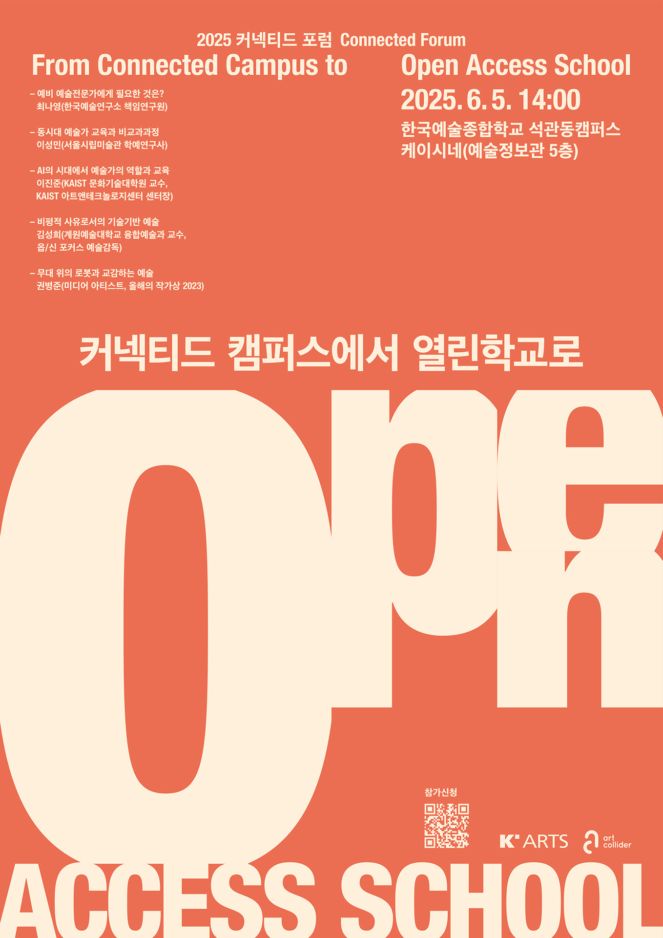 2025 커넥티드 포럼 ‘커넥티드 캠퍼스에서 열린학교로'에 대한 자세한 내용은 한예술종합학교 융합예술센터 아트콜라이더랩 홈페이지(https://www.artcollider.kr/)를 통해 확인할 수 있다.