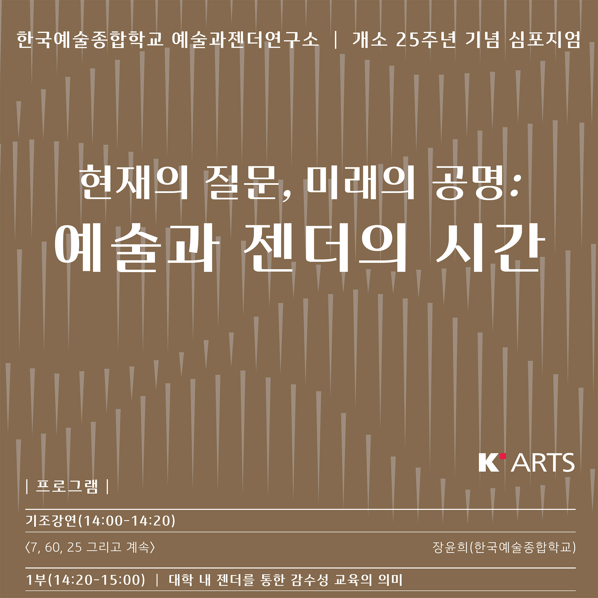 〈현재의 질문, 미래의 공명: 예술과 젠더의 시간〉을 주제로 열리는 심포지엄은 5월 16일(금) 오후 2시 한국예술종합학교 석관동캠퍼스 영상원 대시사실(219호)에서 진행됐다. 이번 심포지엄은 예술과젠더연구소가 지난 25년간 축적해온 학술적 성과를 바탕으로, 예술과 젠더의 교차점에서의 성찰과 미래 방향성을 탐색하기 위해 마련되었다.