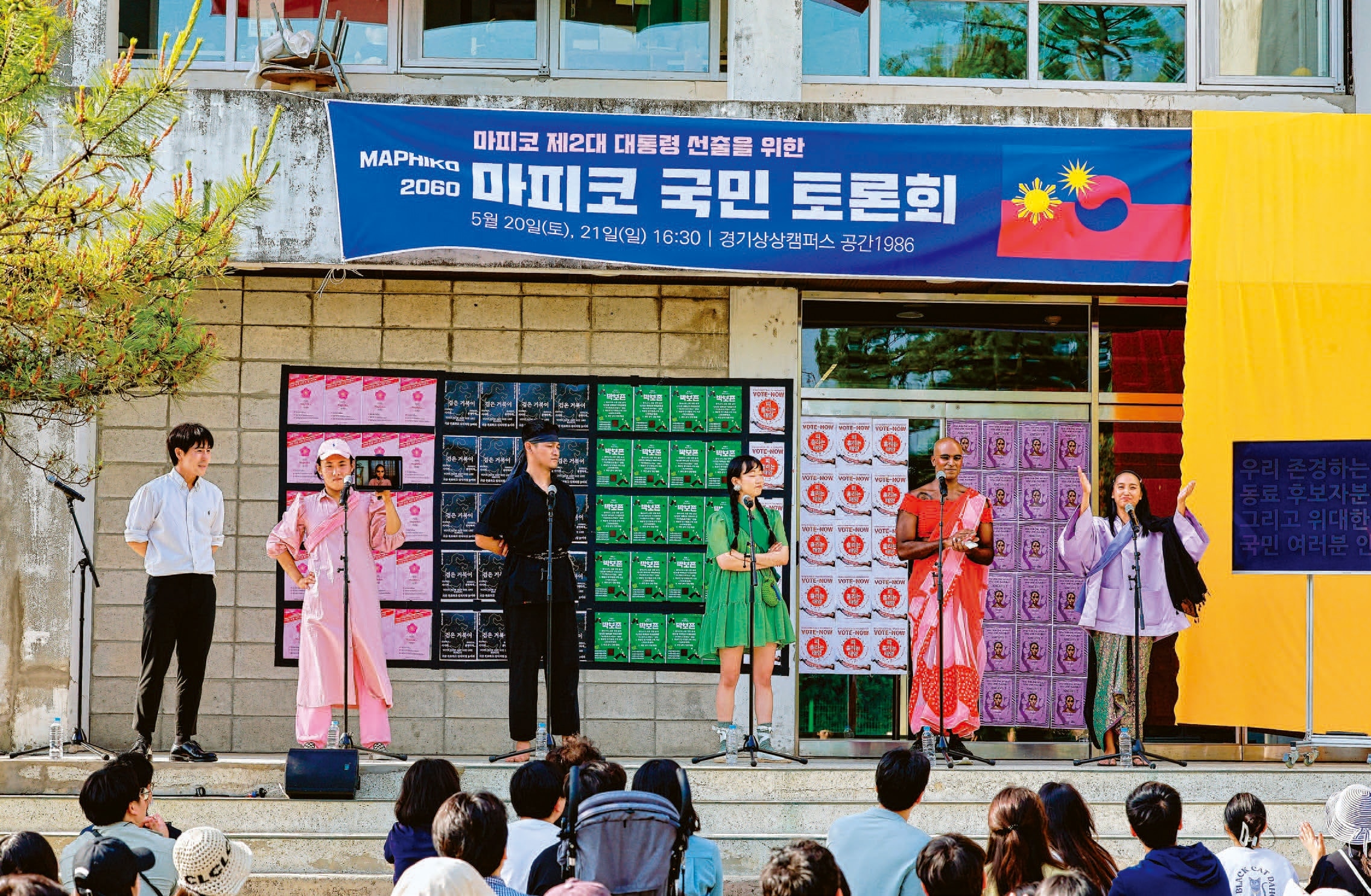 현진 2023년에 수원연극축제에서 〈마피코〉라는 프로젝트 공연을 발표했었어요. 〈마피코〉는 말레이시아, 필리핀, 코리아의 줄임말인데요. 코로나 기간 말레이시아, 필리핀, 한국의 연출가가 매달 온라인에서 진행한 연구 모임이 계기가 됐어요. 서로의 정치 상황을 이야기하고, 가짜 뉴스가 판치는 지금 시대를 연구하자는 논의를 거쳐 국제 협력 작품을 만들기로 의견을 모았죠. 코로나가 끝날 즈음 말레이시아에서 2주간 레지던시를 하면서 공동 창작을 진행했어요. “가짜 뉴스와 정치 상황을 이야기하기 위해 국가를 설립하자. 그 국가의 이름은 마피코다!” 선언하고, 관객들이 마피코 국가의 대통령을 직접 선출하게 하는 일종의 포럼 연극을 만들게 됐어요. 작품을 만들면서 각 국가가 가진 정치적 쟁점, 근현대 역사적 배경을 담아내면서 서로의 이야기가 교차할 수 있게끔 했어요. 그 과정에서 텍스트만으로 이해할 수 없었던 아시아의 여러 정치적인 맥락처럼 지금 우리가 마주하고 있는 사회의 이슈를 공부했어요. 이런 방식의 연극 만들기를 통해 방대한 미시사들이 흩어지지 않고 두껍게 읽히는 순간을 경험했죠.