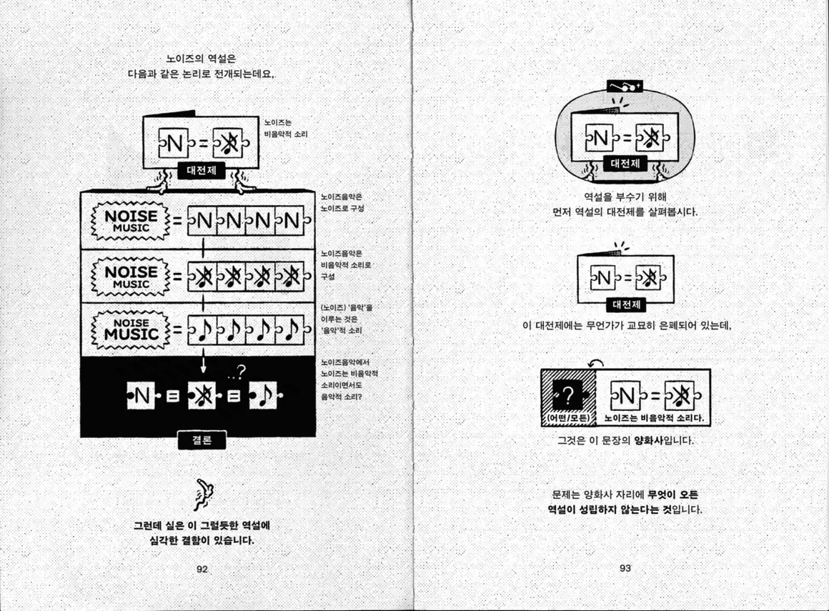 전대한이 책 전체를 통틀어 즐겨 쓰는 표현 가운데 하나가 ‘축자적’이다. 영어로는 ‘literal’인데, 글자 하나하나를 좇아 충실하게 풀이하는 태도를 뜻한다. 그는 문장을 당위, 사실, 가치, 주장, 존재 등으로 세분화하고, 실제 문장에서 그것들이 어떻게 섞여 쓰이는지를 살펴본다. 그러다 보니 책 곳곳에서 양화사나 지시사, 귀추법과 같은 논리학의 용어가 반복된다. 이러한 단어들이 독자에게 낯설게 다가올 수 있으나, 전대한은 그것들을 논리의 도구로 삼아 명제나 자신의 주장이 타당한지를 확인한다. 직관과 명제 사이에 괴리가 있다면, 추론을 거쳐 그 차이를 좁히고 명료한 언어에 도달하려 한다.